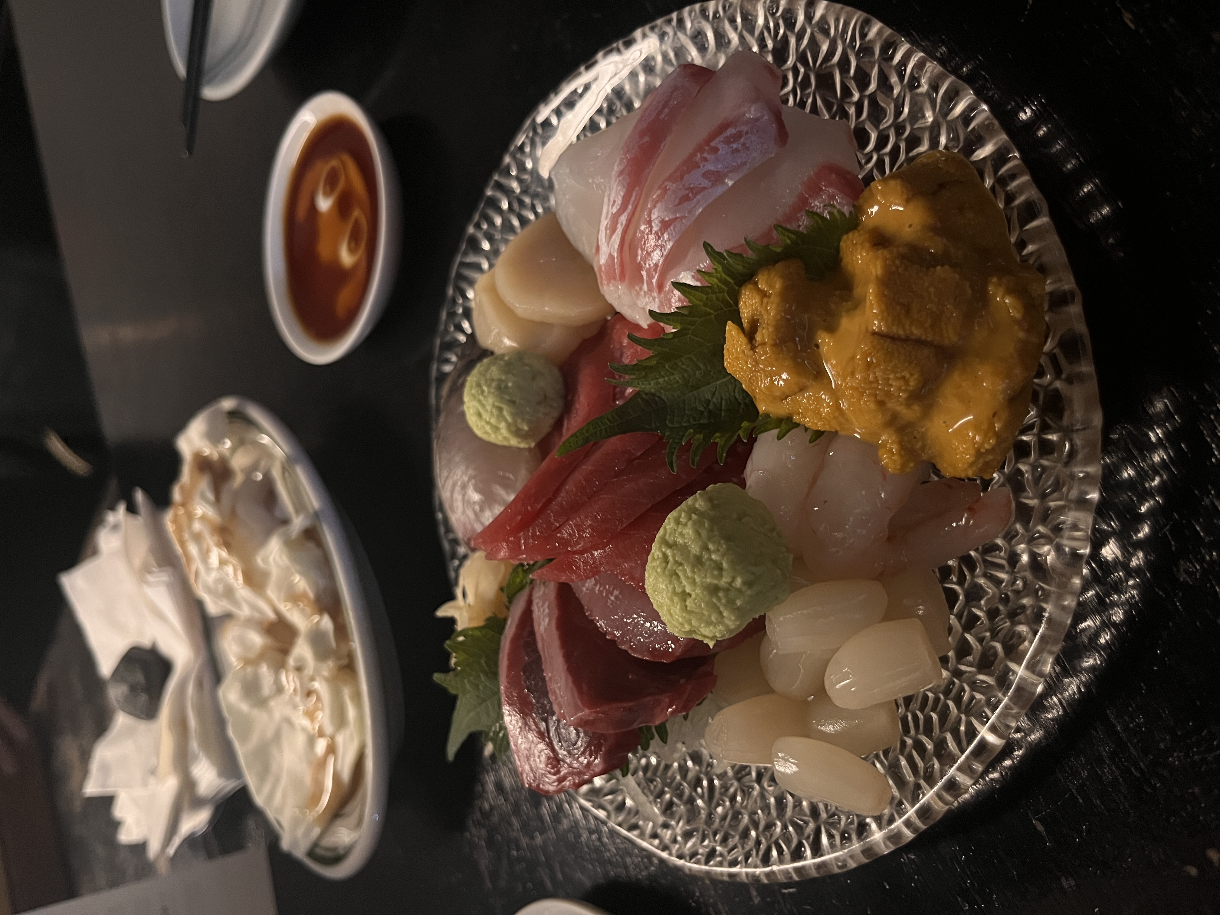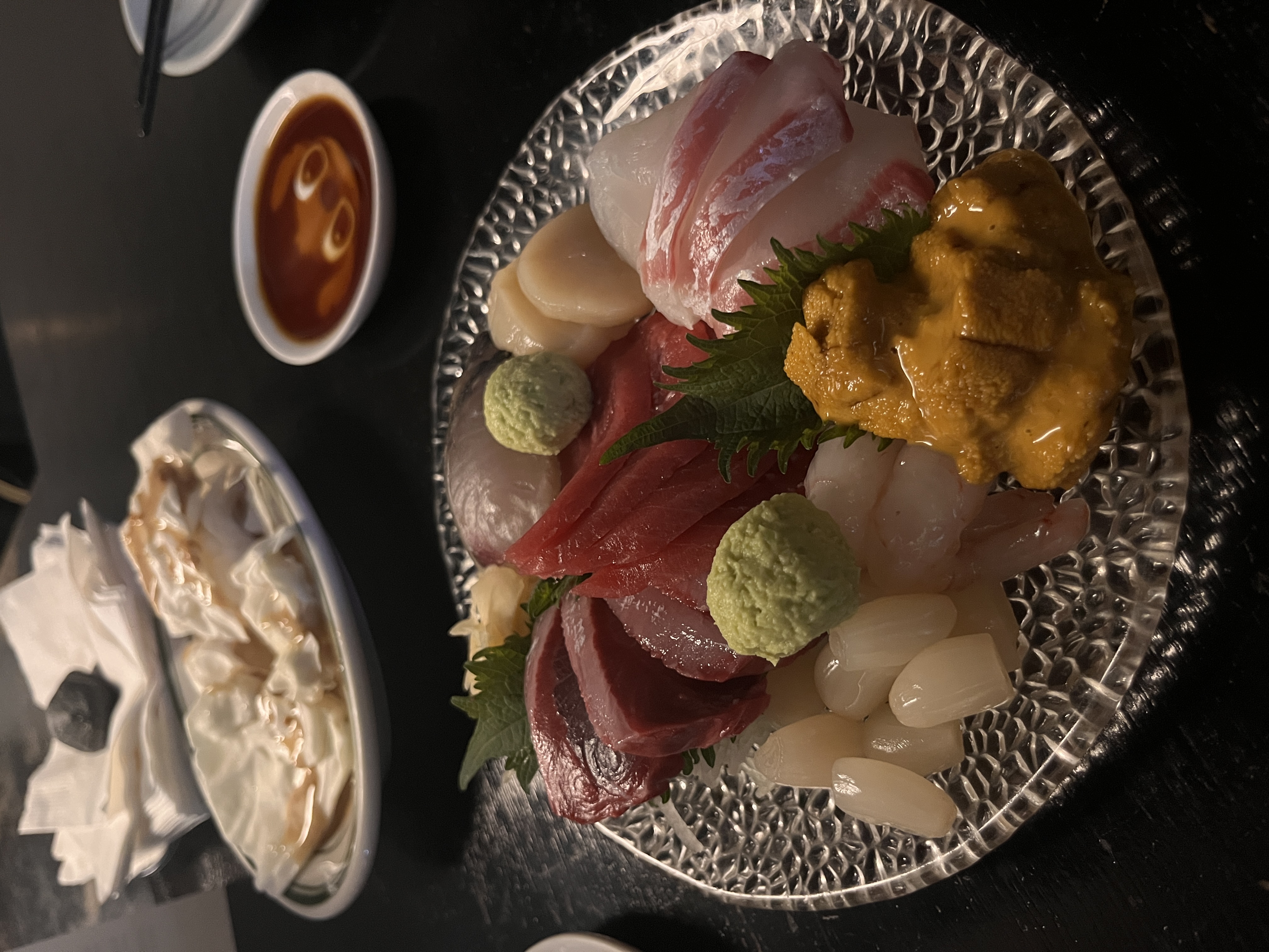 동기오빠한테 추천받은대로 모듬숙성사시미(우니추가), 고등어 봉초밥, 치킨난반을 주문했습니다!