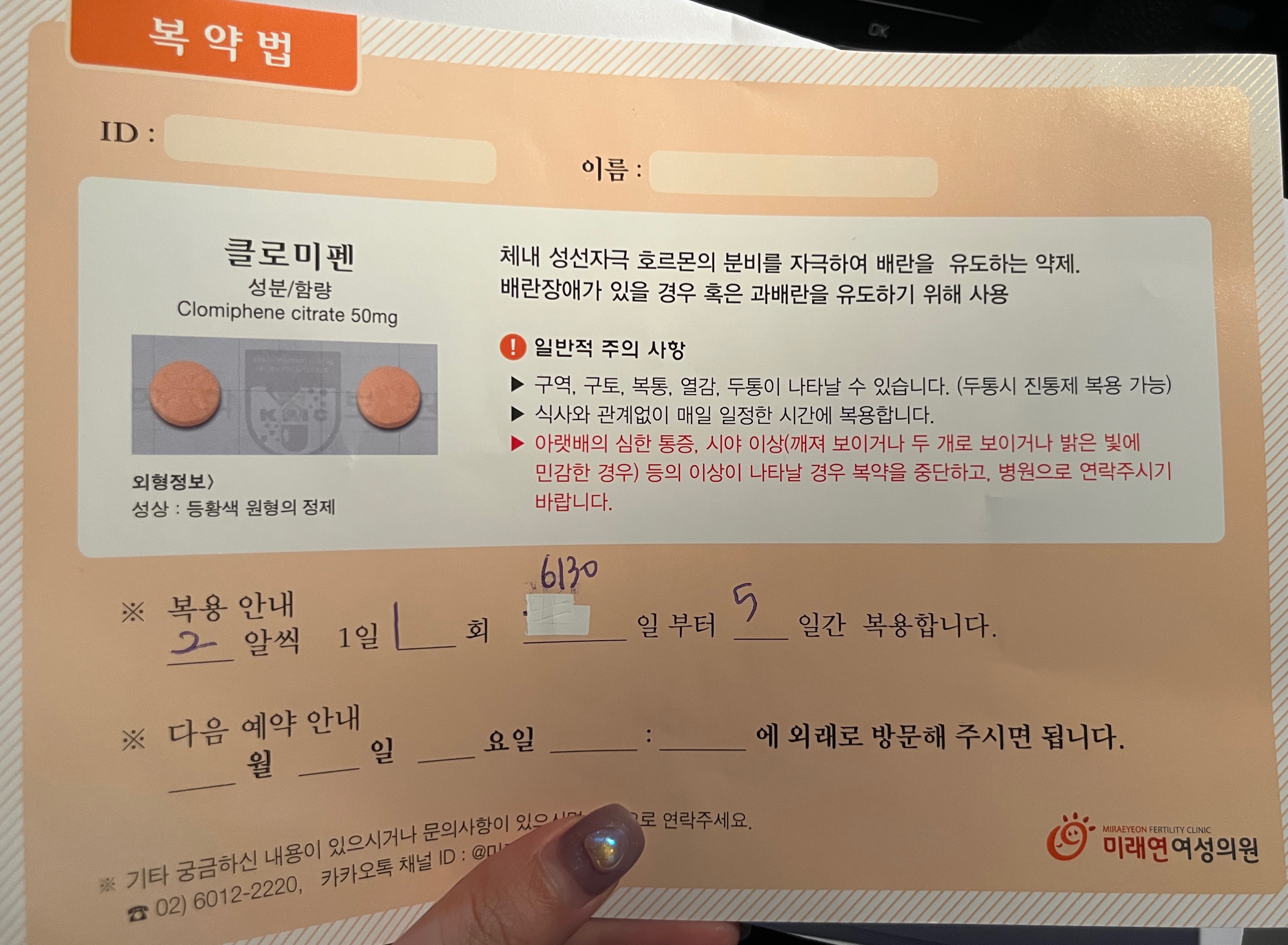 저는 조은혜 원장님이 진료를 봐주셨어요. 생리가 규칙적이고 그동안 배란이 잘 되었다면 충분히 자연임신 가능할 거라고 말씀해주셨습니다. 이 날 호르몬 검사 진행했고,,, 제 마음이 조금 급하다고 말씀드리니 배란유도제를 처방해주셨습니다ㅋㅋㅋㅋㅋㅋ 클로미펜 이라는 배란유도제를 처방해주셨고 매일 같은 시간에 2알씩 5일간 복용하라고 하셨어요. 다른 분들의 후기를 보니 부작용 이야기도 하시던데 저는 큰 이상 없이 복용했던 것 같습니다. 약 잘 먹고 배란일 호르몬 검사 확인을 위해 10~11일 정도 후 병원에 한번 더 방문했고 이번엔 이전에 받은 산전검사지도 가져갔습니다.(저랑 오빠거 둘 다)