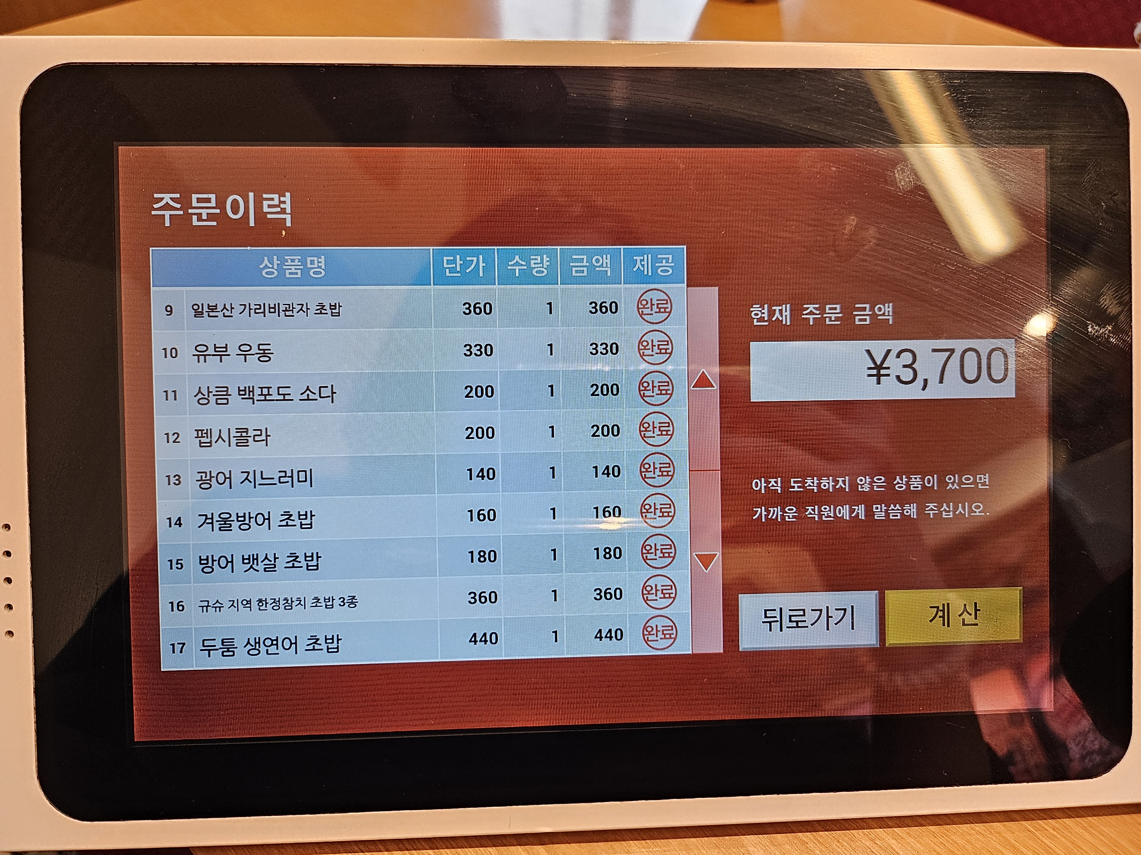 주문을 하면 이렇게 초밥이 옵니다,,ㅎ 주문은 각 테이블마다 테블릿이 있어서 주문가능하고 한국어로 표기 된 메뉴도 볼 수 있어요!