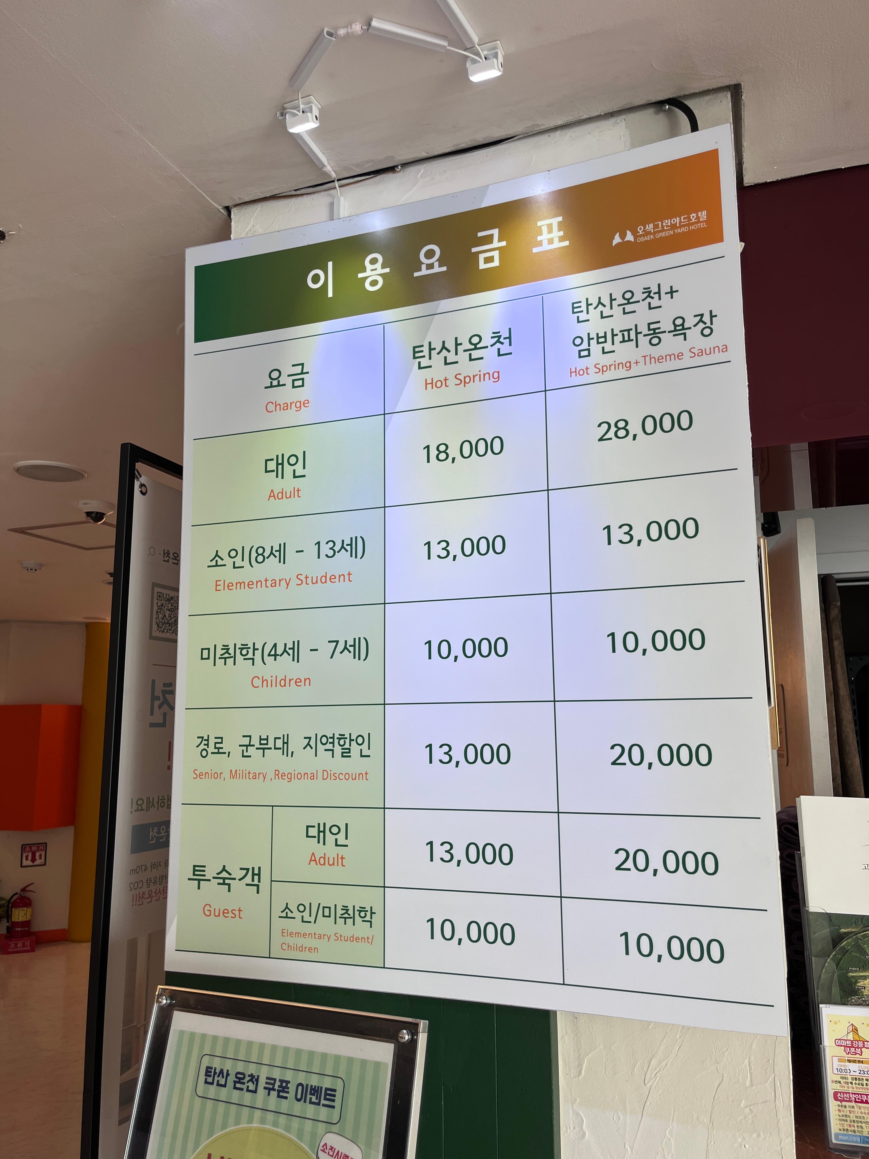 저흰 찜질방은 이용하지않고 온천만 이용하기로 했는데요, 기본요금은 18,000원 입니다.(대인기준)