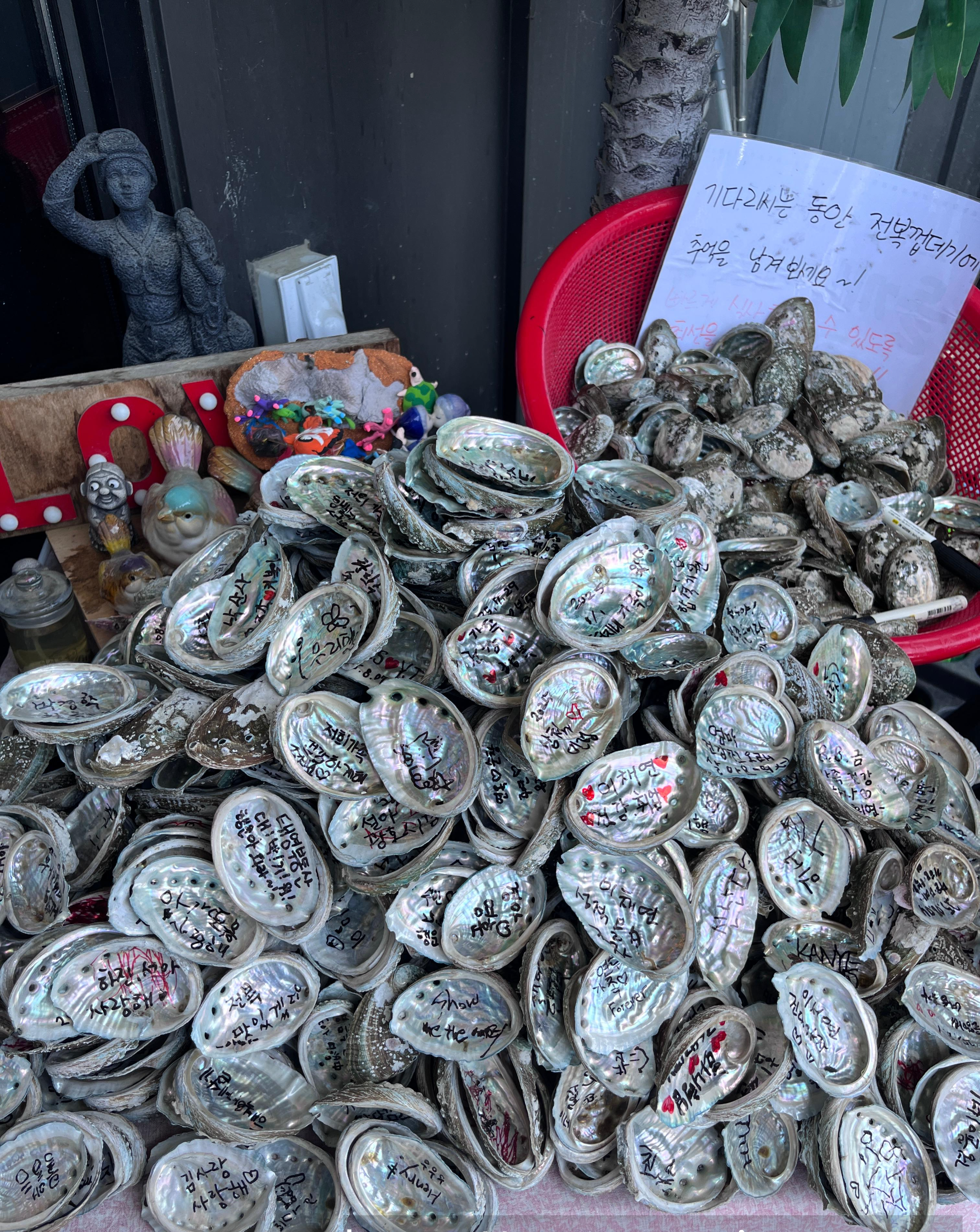 기다리는 중 앞에 쌓여있는 전복 껍질,,
